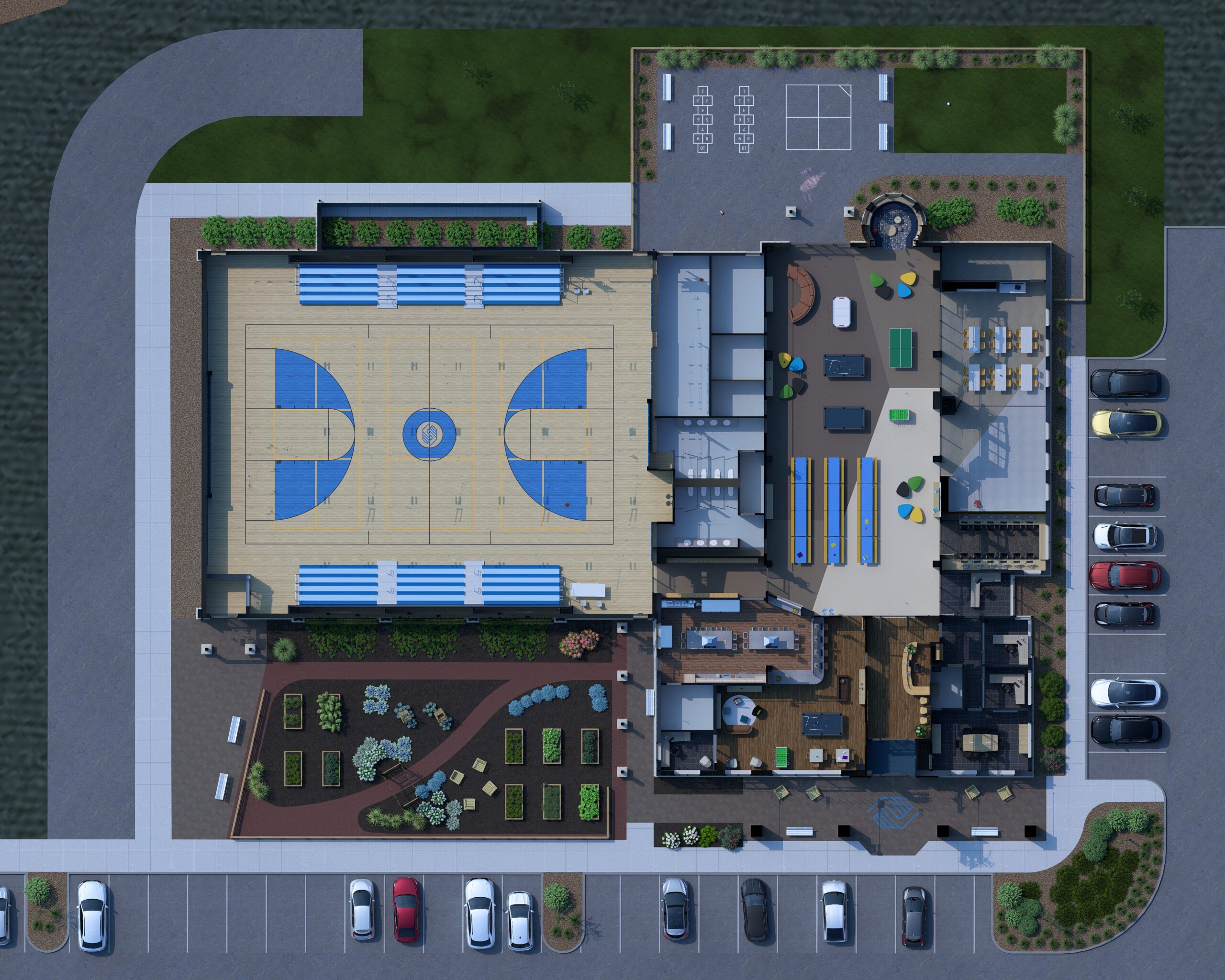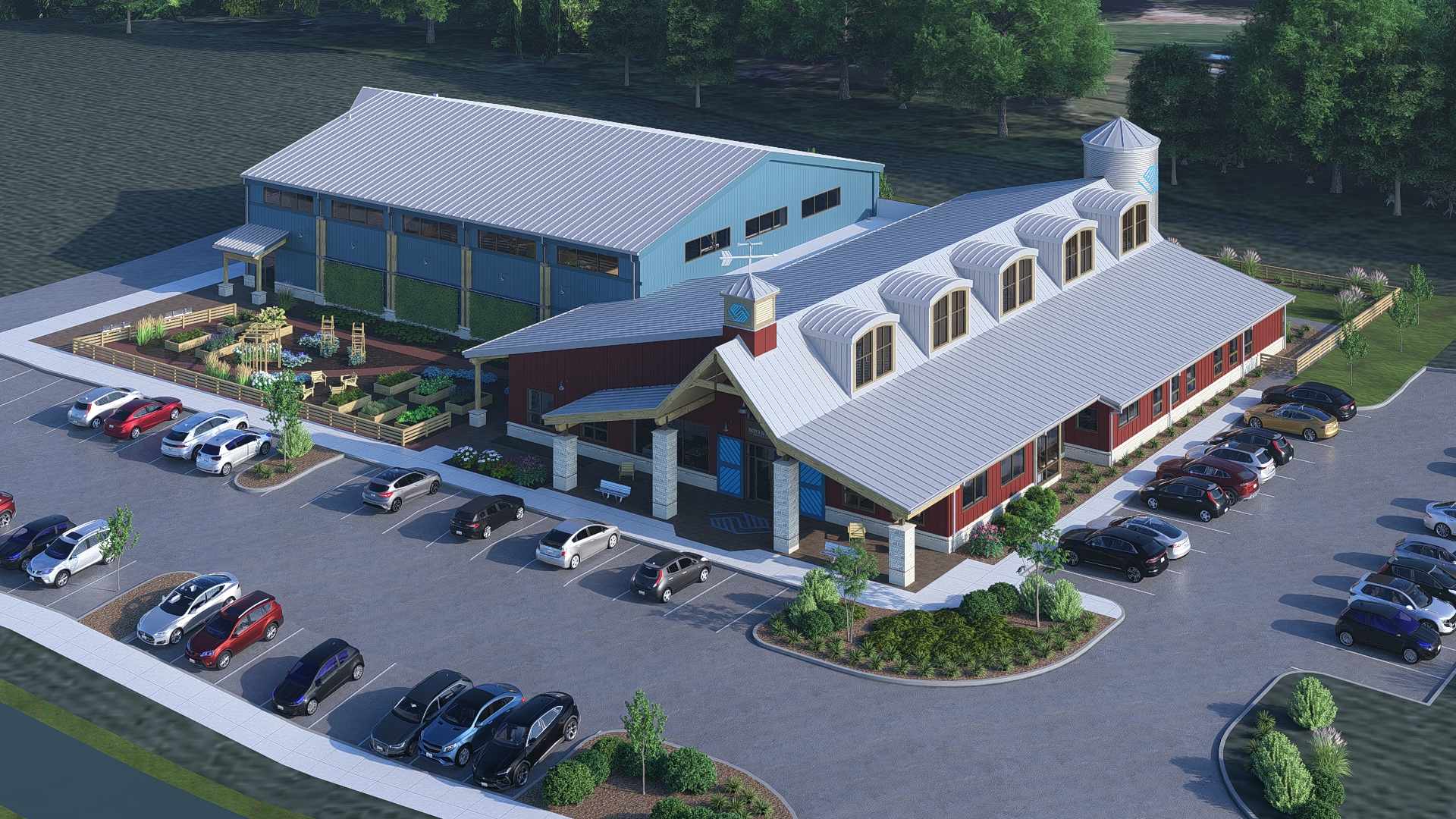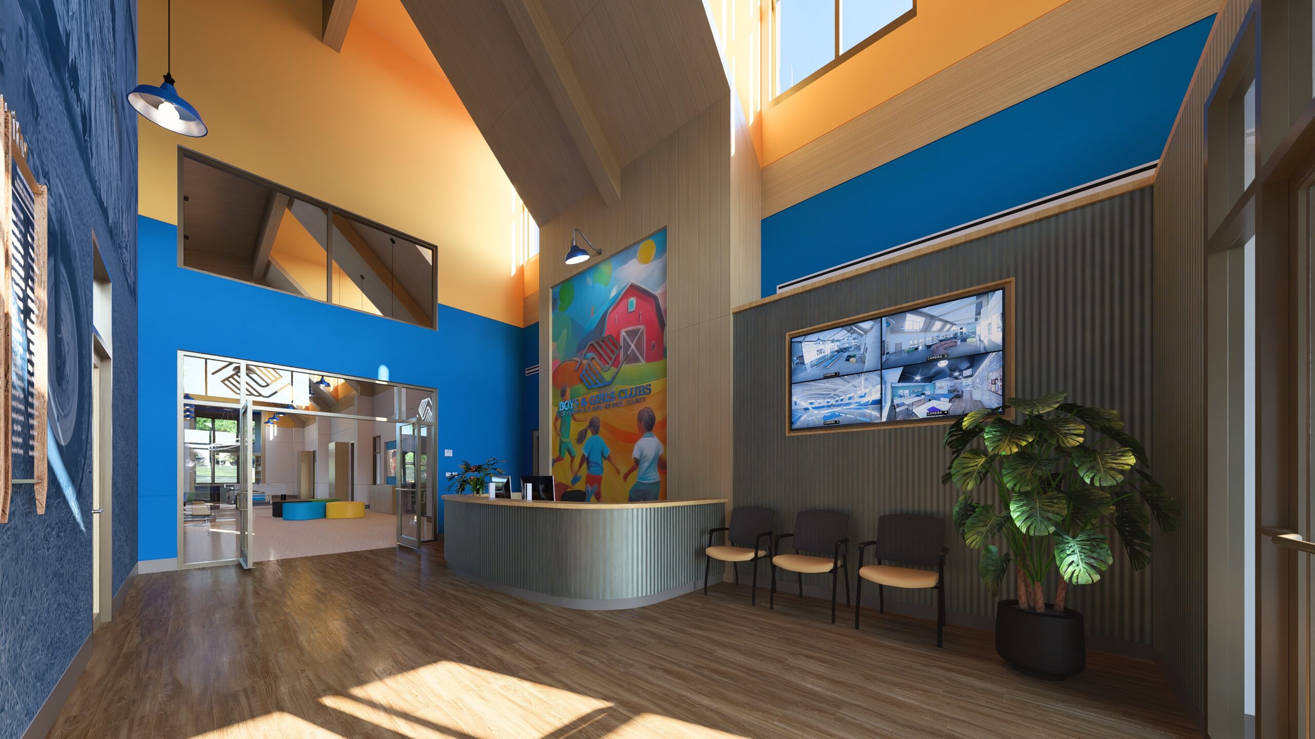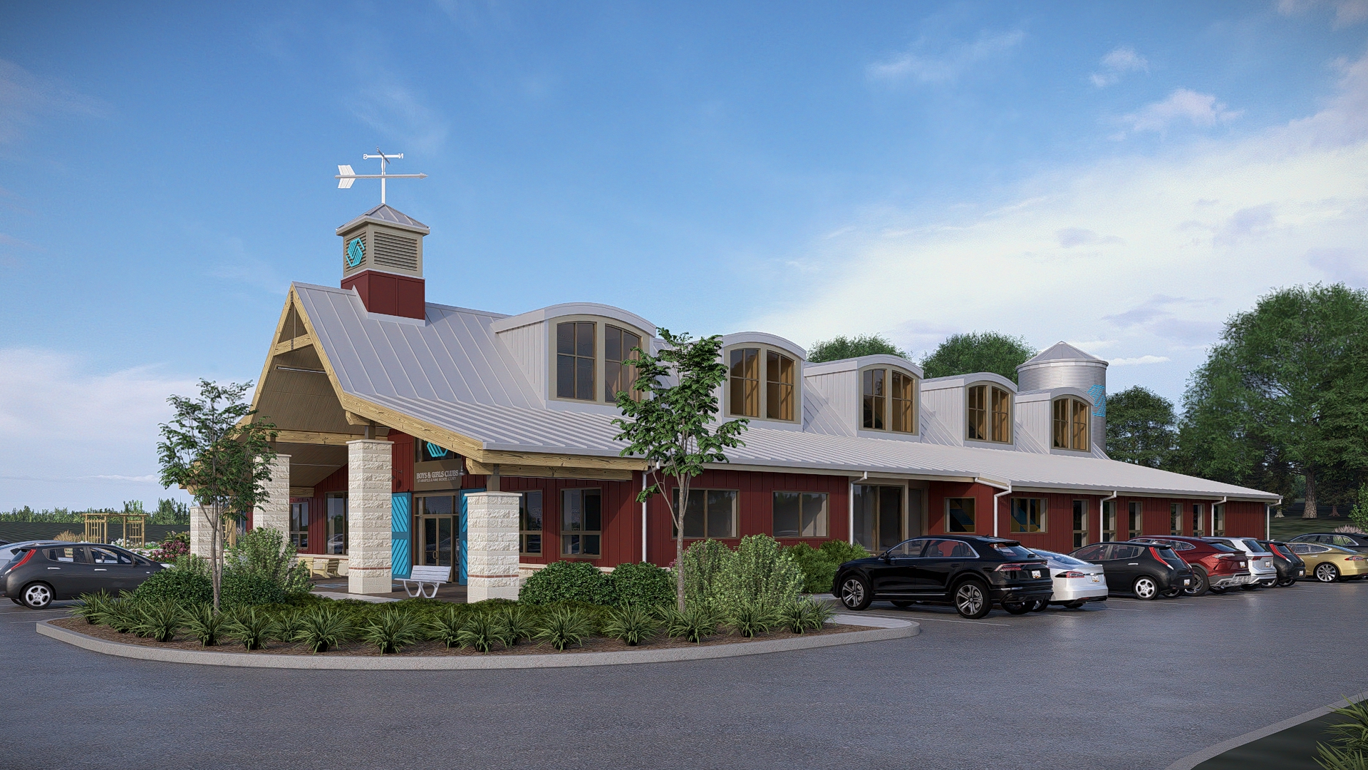 The design concept emphasizes security and visual openness for staff to be able to monitor the minor club attendees, as well as durability and flexibility for diverse programming. The building exterior is styled to fit into its rural setting on a property that was previously farmland and has large windows, dormers, and clerestory glazing for natural light and connection to the landscape. The site design includes outdoor recreation areas and a learning garden for teaching about agriculture and nutrition.