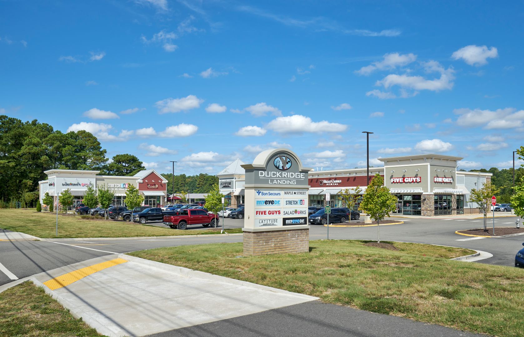 Duckridge Landing is a commercial development located on waterfront property along Swift Creek Reservoir in the rapidly growing Chesterfield suburb of Richmond. The project includes three one-story retail buildings offering a total of 28,000 square feet of shops and restaurants, as well as a 19,000-square-foot, two-story office building. The buildings, clad in masonry and siding, are designed to reflect a traditional waterfront aesthetic with elements of the Tidewater style. The development also features a waterfront patio area for outdoor dining.