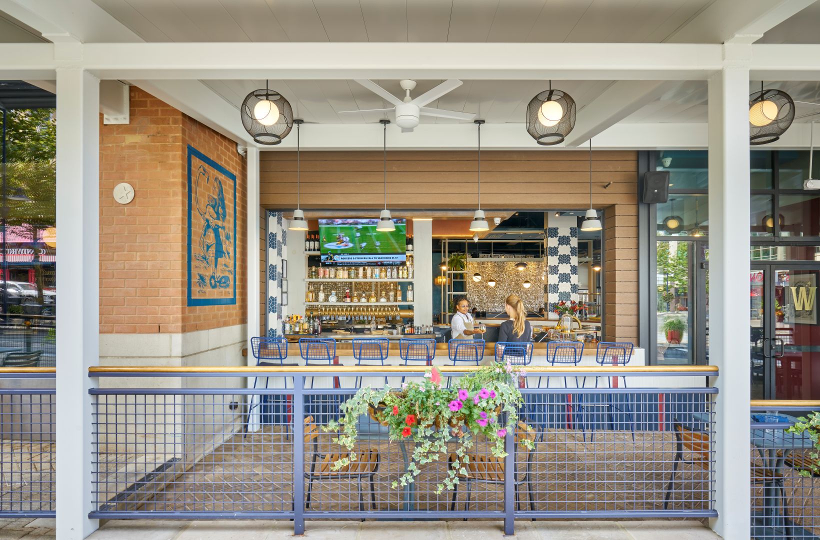 Whimsical elements and colorful tilework are balanced with refined furnishings, lighting, and finishes to create a space full of charm and character. The patio was enhanced with a tidewater-style metal canopy and an indoor-outdoor bar with a garage-style shutter, extending seasonal use and visually connecting the interior and exterior.