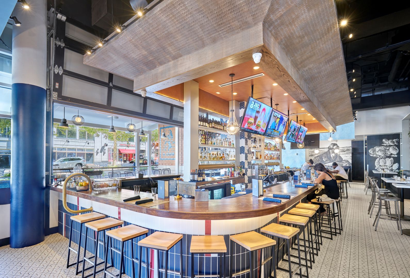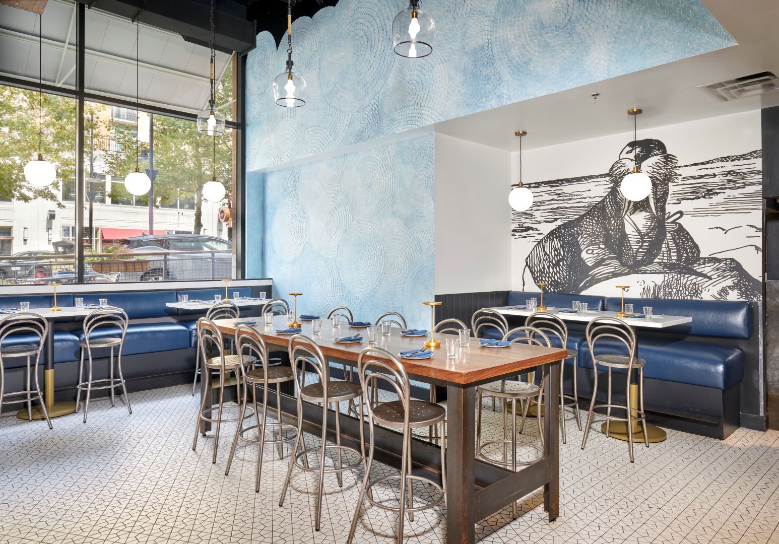 Bignell Watkins Hasser Architecture & Interiors (Bigwaha) provided architectural and interior design services for the renovation of The Walrus Oyster & Ale House, newly completed at National Harbor. The transformation reflects the restaurant’s focus on high-quality seafood and an elevated yet whimsical dining experience within a modern, coastal-inspired setting.