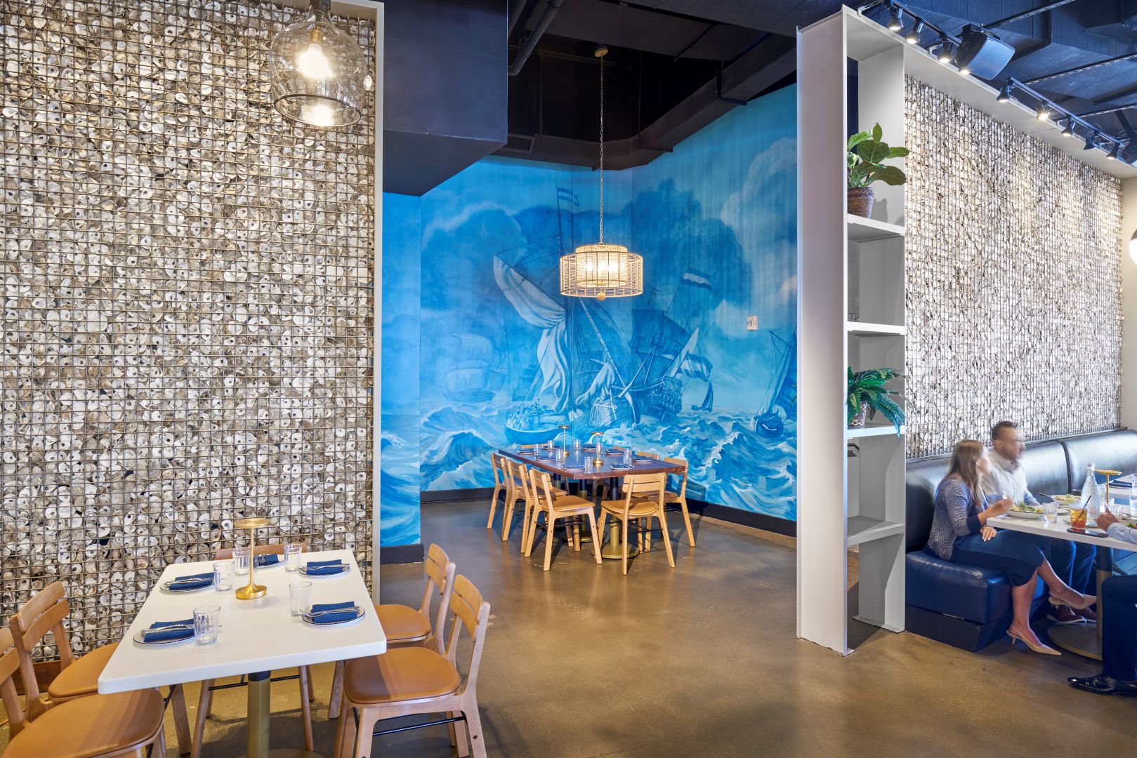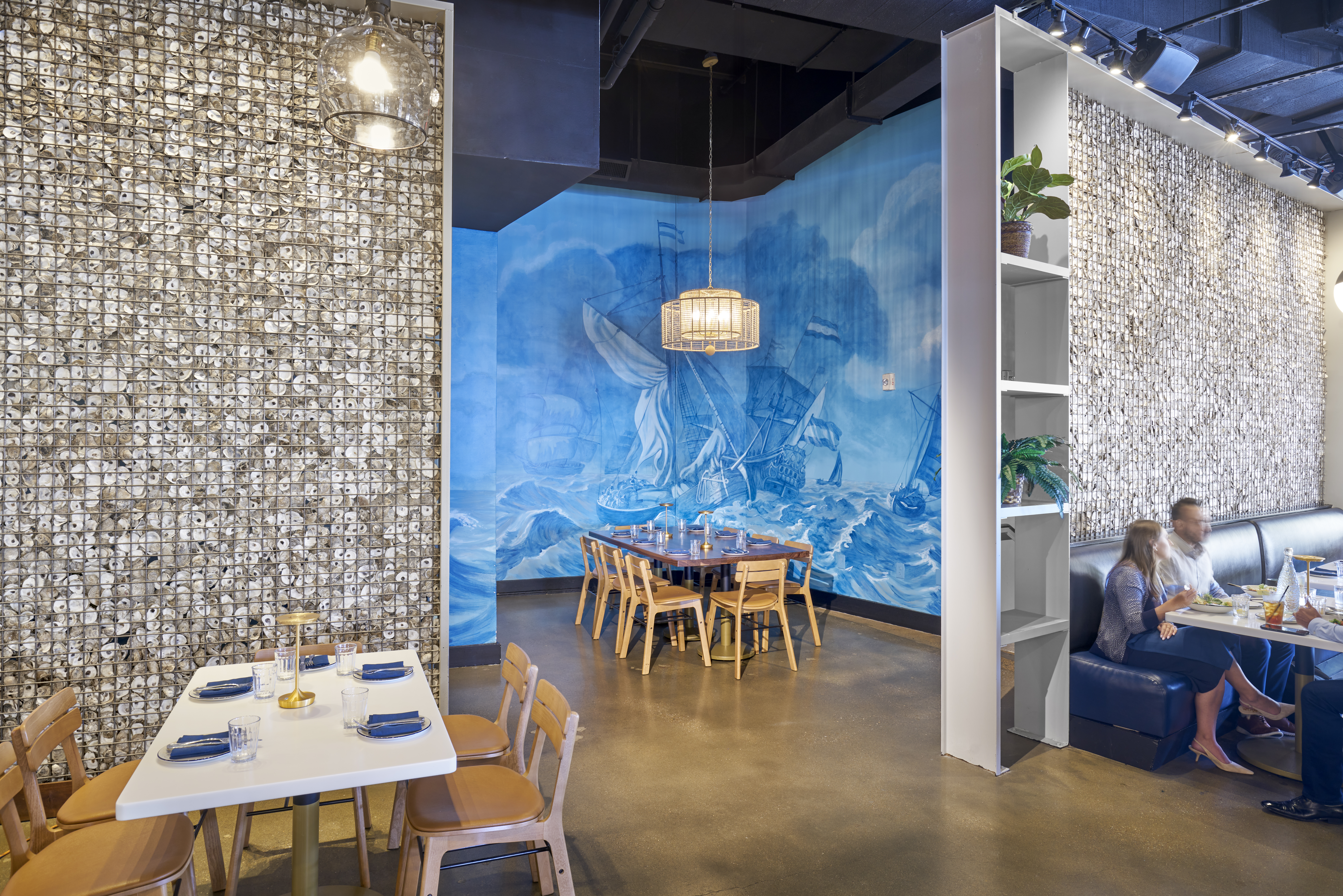 Working closely with the owner and Maryland-based artisans Kelly L. Walker and McLain Wiesand, Bigwaha infused the space with custom artistry—including hand-painted murals inspired by Alice in Wonderland and the Chesapeake oyster industry, fish scale-like plaster walls, convex mirror features, and gabion partitions filled with reclaimed oyster shells.