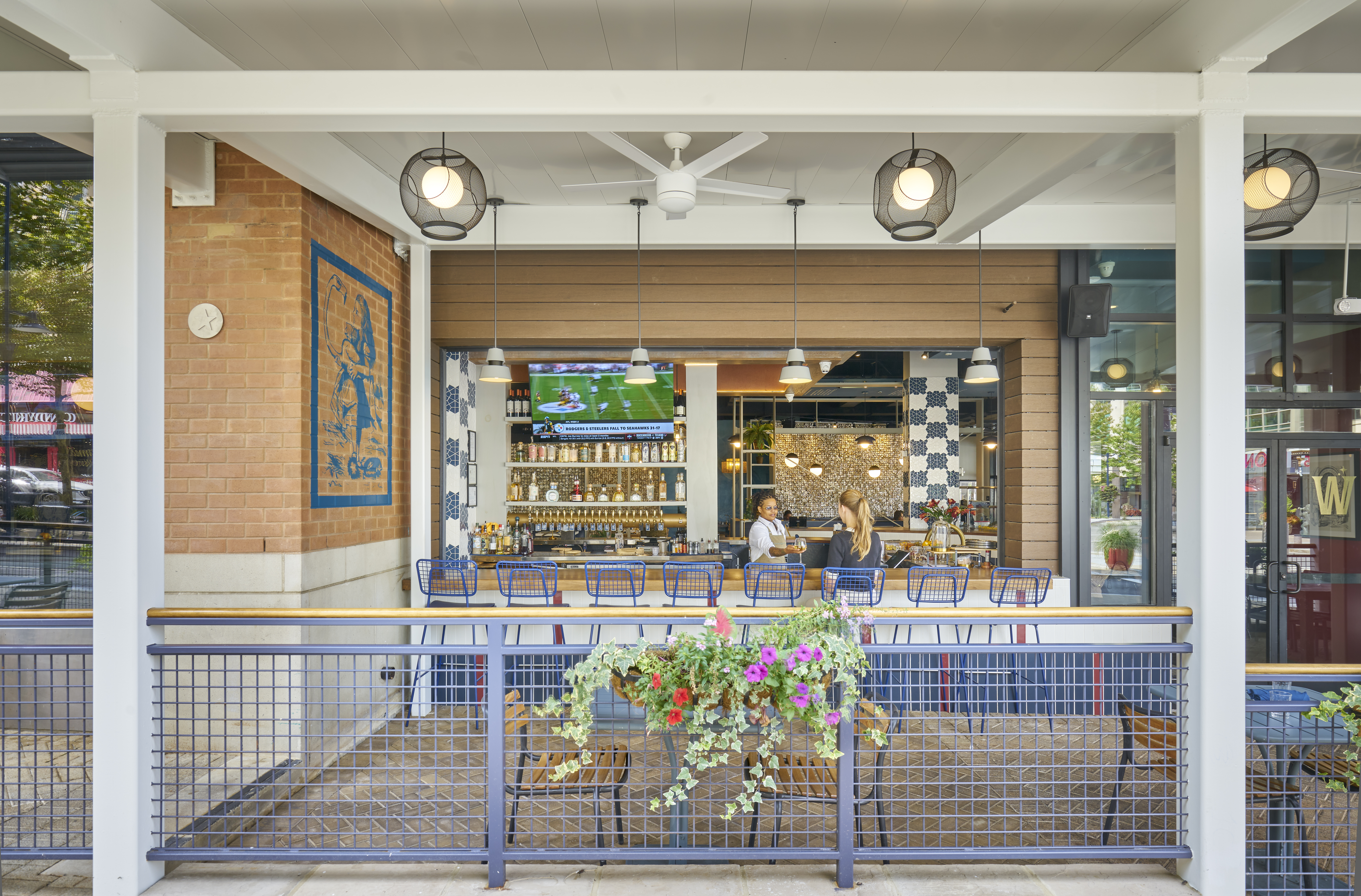 Whimsical elements and colorful tilework are balanced with refined furnishings, lighting, and finishes to create a space full of charm and character. The patio was enhanced with a tidewater-style metal canopy and an indoor-outdoor bar with a garage-style shutter, extending seasonal use and visually connecting the interior and exterior.