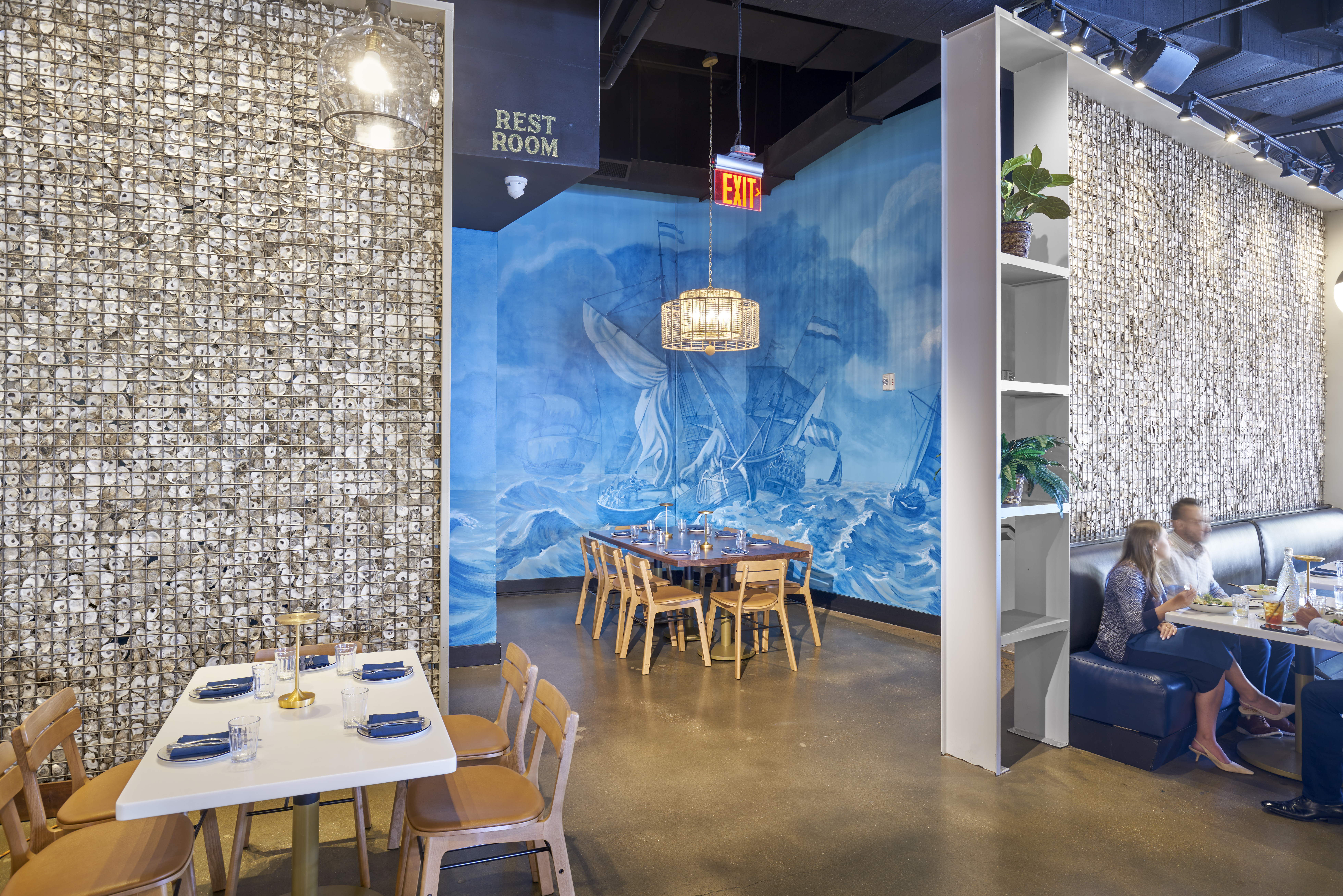 Working closely with the owner and Maryland-based artisans Kelly L. Walker and McLain Wiesand, Bigwaha infused the space with custom artistry—including hand-painted murals inspired by Alice in Wonderland and the Chesapeake oyster industry, fish scale-like plaster walls, convex mirror features, and gabion partitions filled with reclaimed oyster shells.
